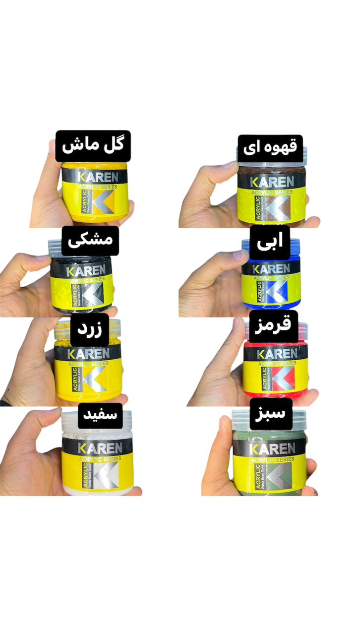 رنگهای اصلی (مادر رنگ): به رنگهایی گفته میشود که برای ساخت سایر رنگها با هم ترکیب میشوند. این رنگها معمولاً شامل قرمز، زرد و آبی هستند. رنگهای اکریلیک کارن: برند کارن یکی از تولیدکنندگان رنگهای اکریلیک است که رنگهای اصلی را در محصولات خود عرضه میکند.